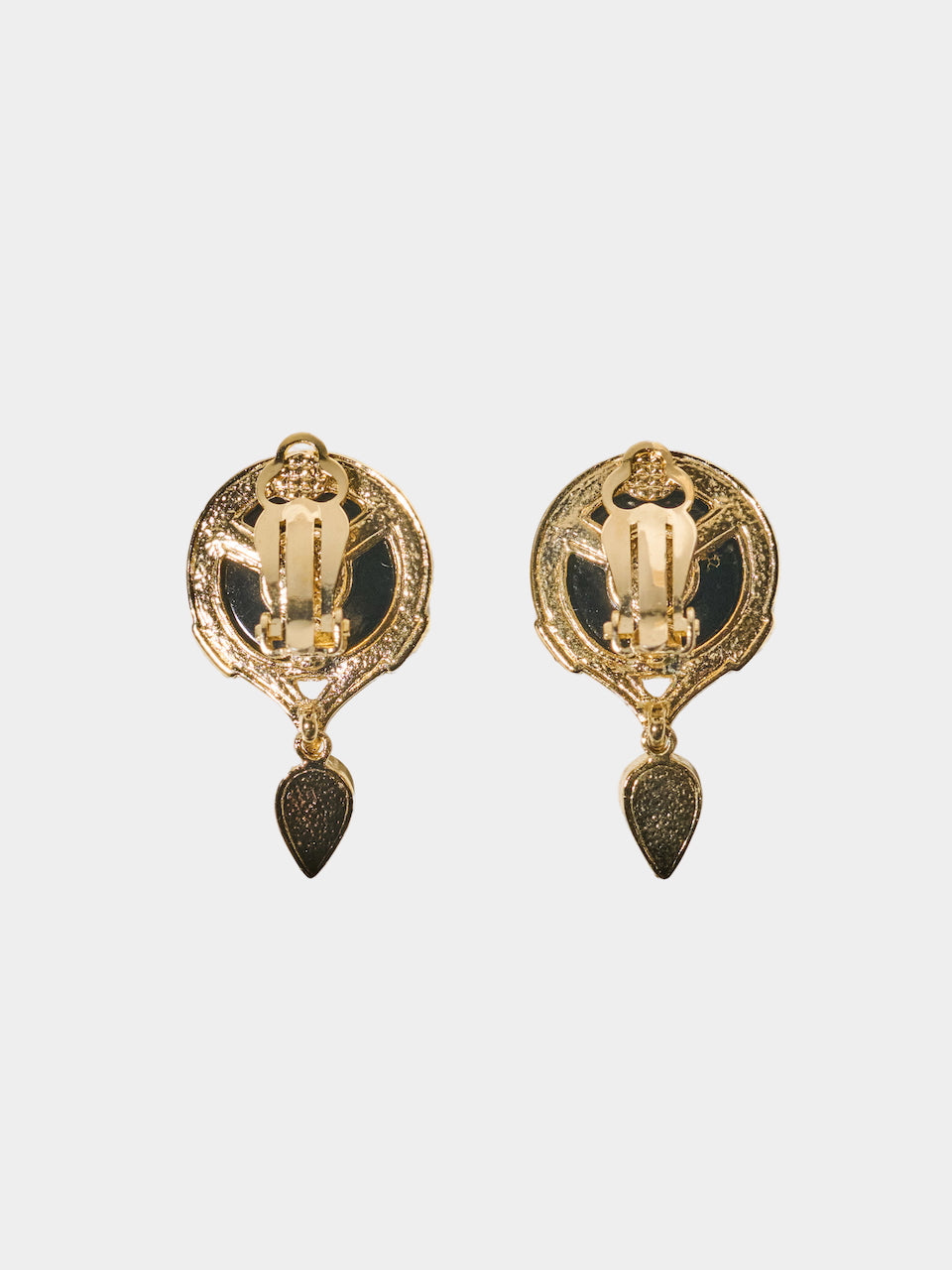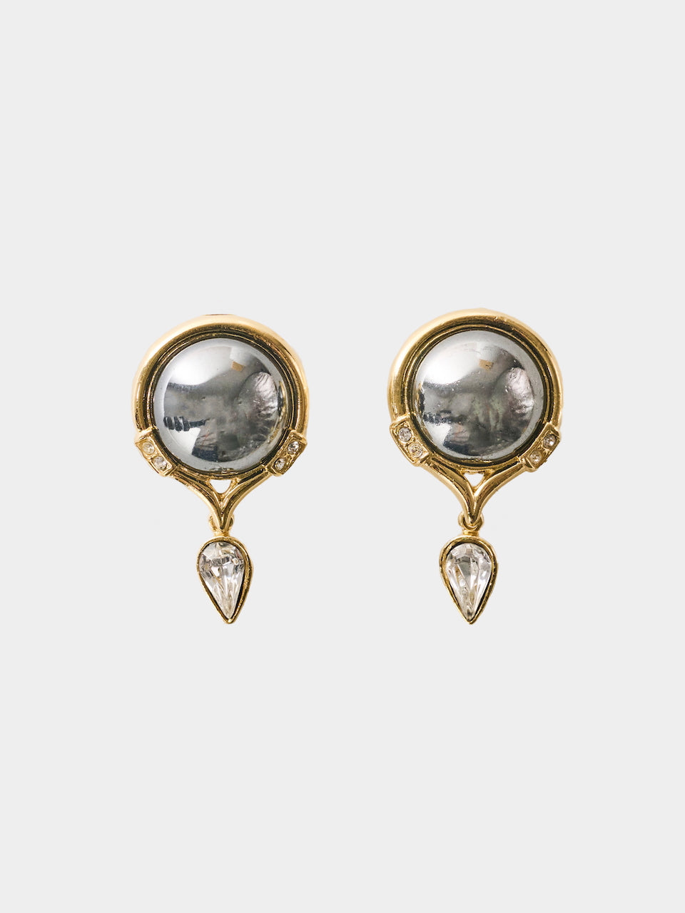 Boucles d’oreilles vintage dorées, composées d’un cabochon effet perle Tahiti et d’un pendentif en forme de goutte transparente. Un modèle élégant et lumineux, facile à porter au quotidien comme en soirée.