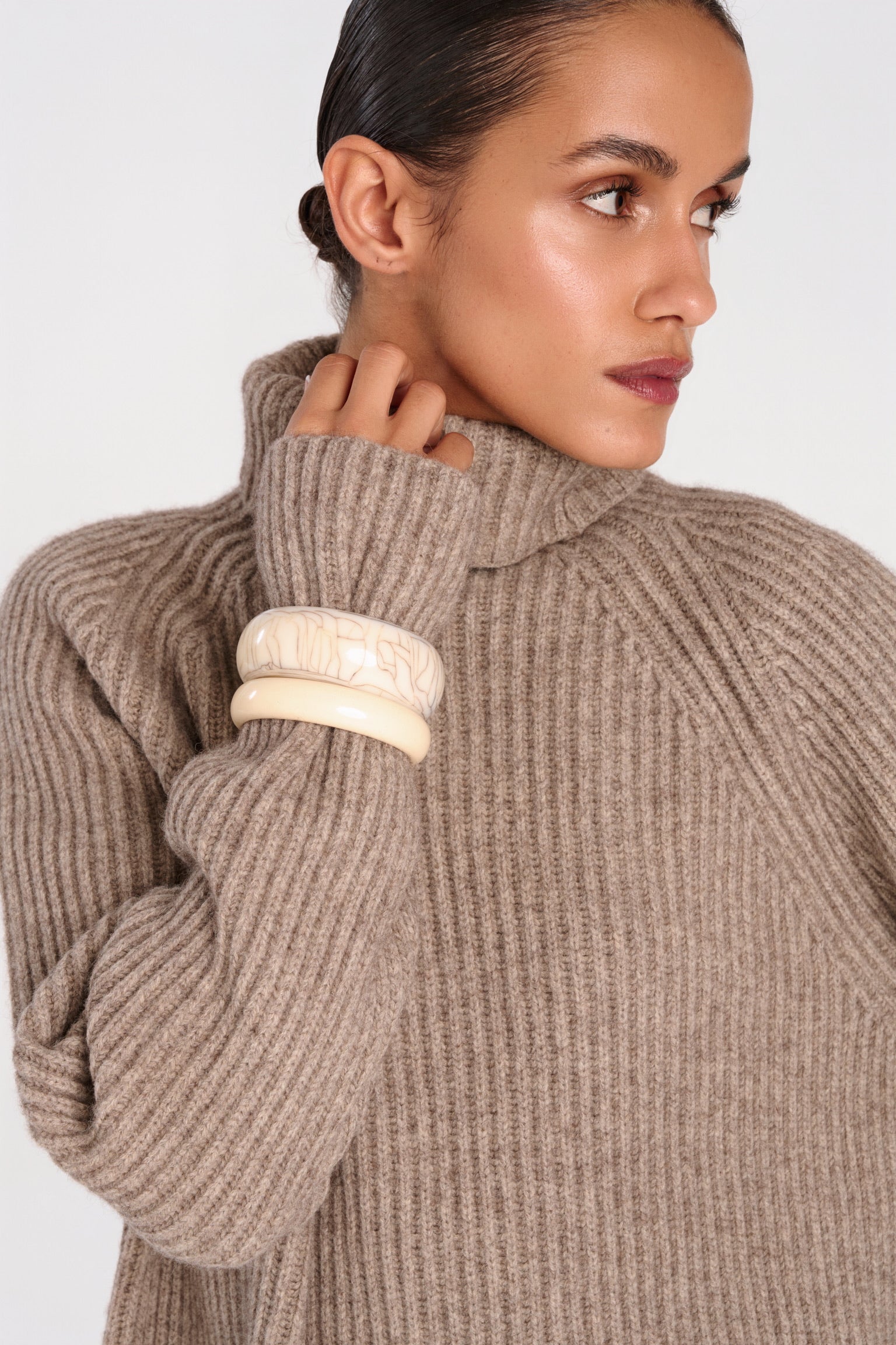 Couleur crème / ivoire, texture lumineuse, silhouette 90’s assumée.