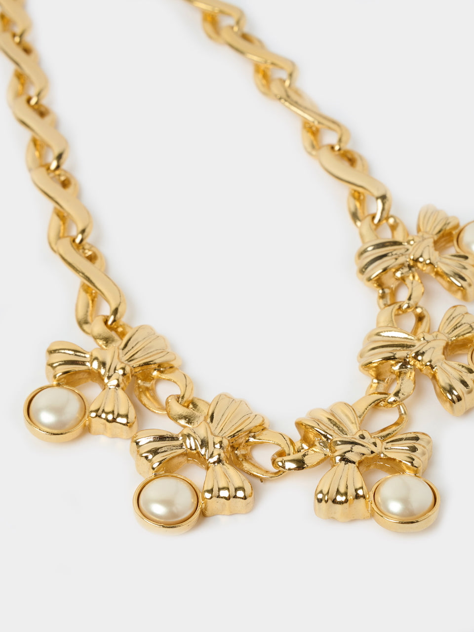 GALA. Un collier vintage au charme couture, travaillé en chaîne torsadée et ponctué de perles crème sous des nœuds sculptés. Une pièce rare, féminine et imposante à la fois, qui transforme instantanément une silhouette.