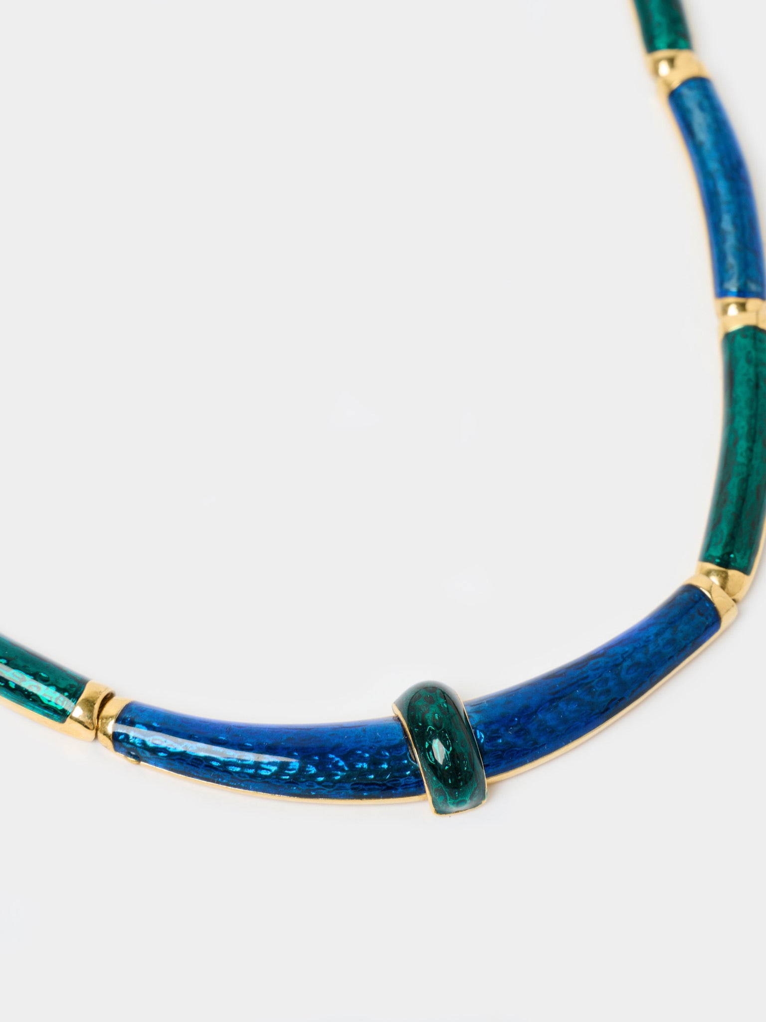 Collier vintage 80/90 composé de segments en métal bleu et vert, sertis de détails dorés. Une pièce statement, graphique et lumineuse.