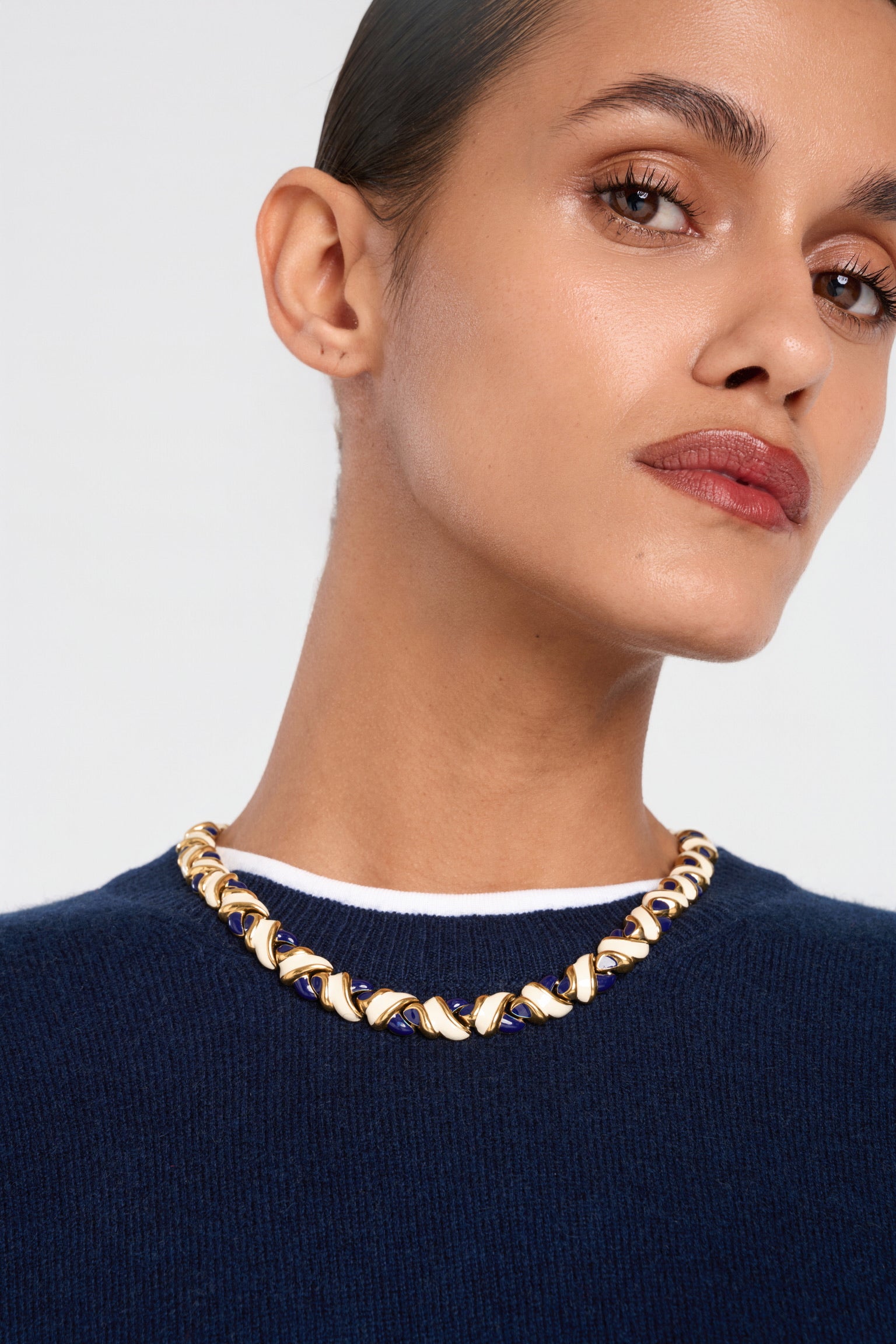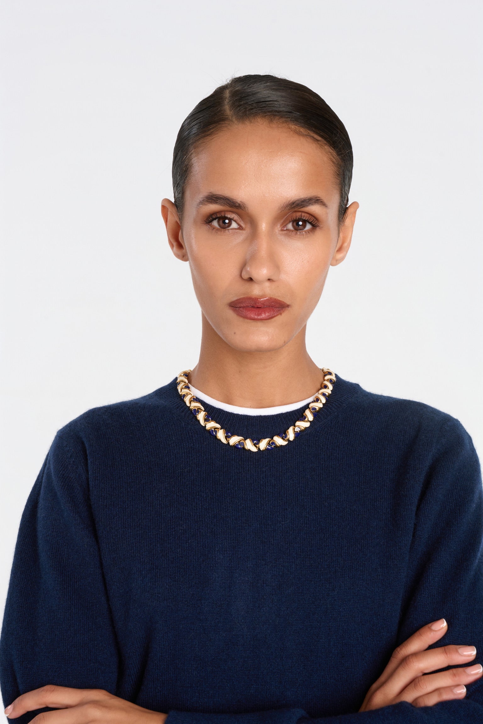Ce collier vintage RIVAGE et un modèle très graphique, pensé dans le moindre détail. Le mélange crème/marine fonctionne avec tout, du denim brut au pull bleu marine. Une pièce intemporelle qui sublimera vos pulls en cachemire cet hiver, et vos tee-shirts blancs en été.