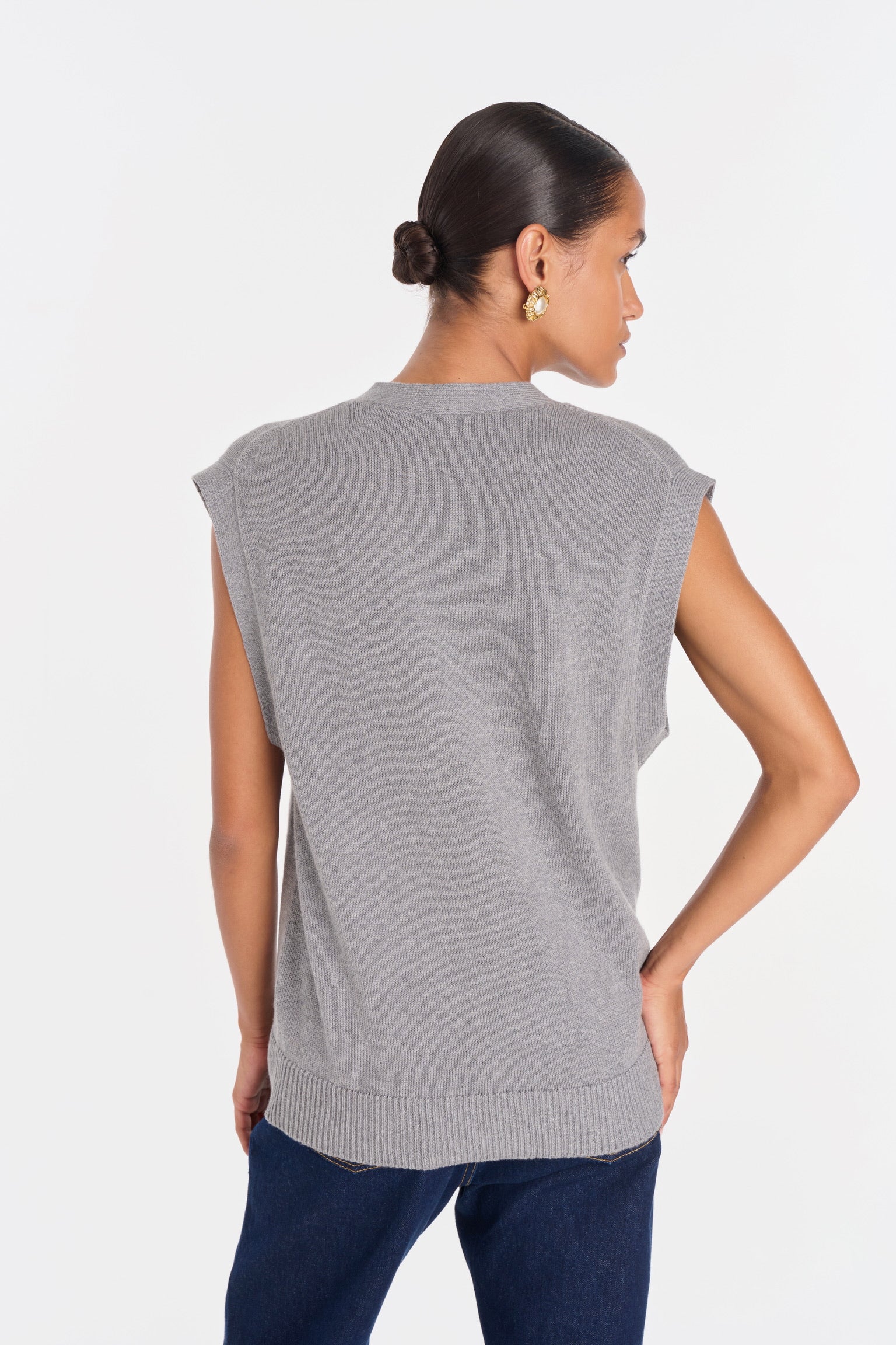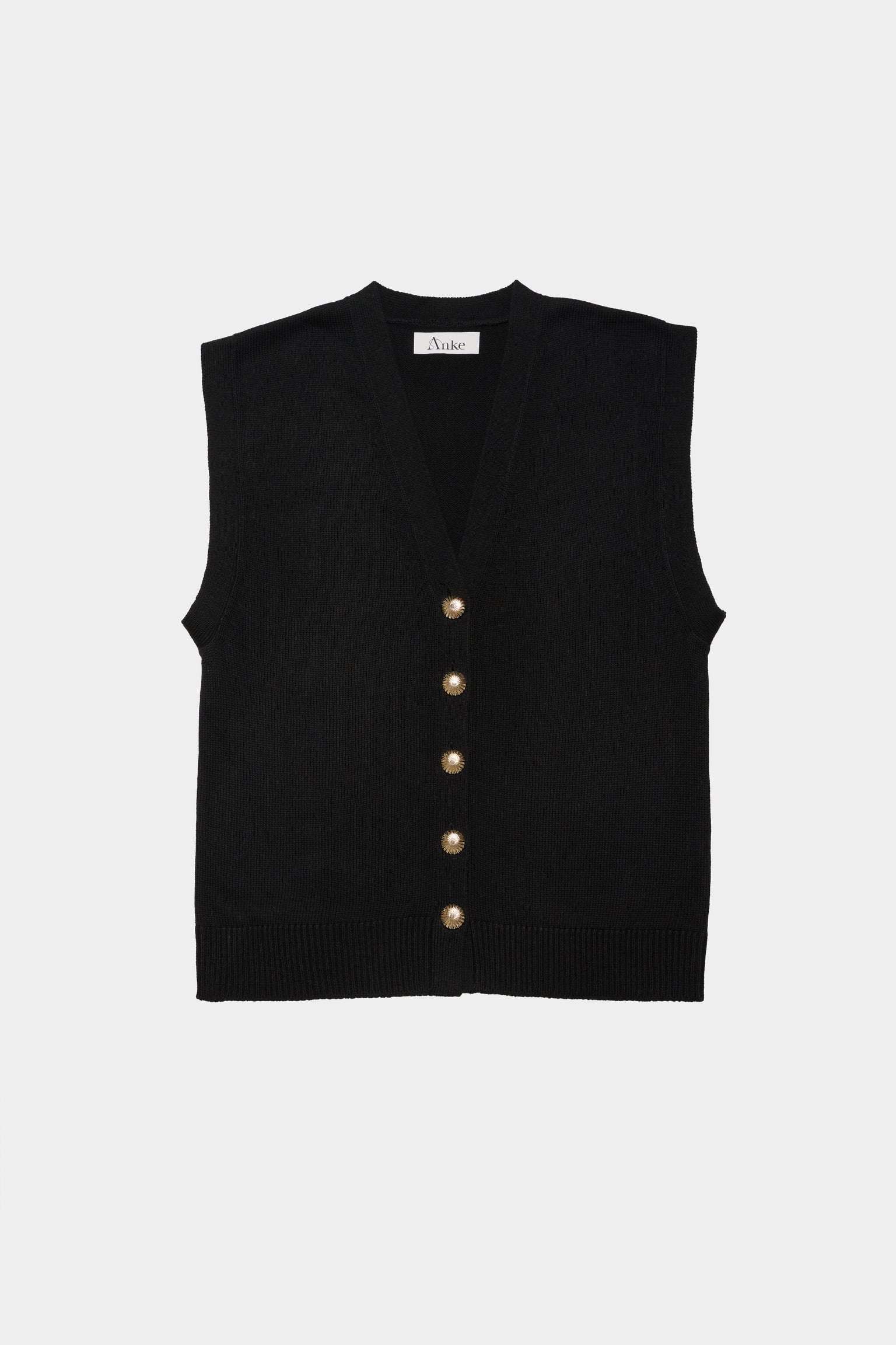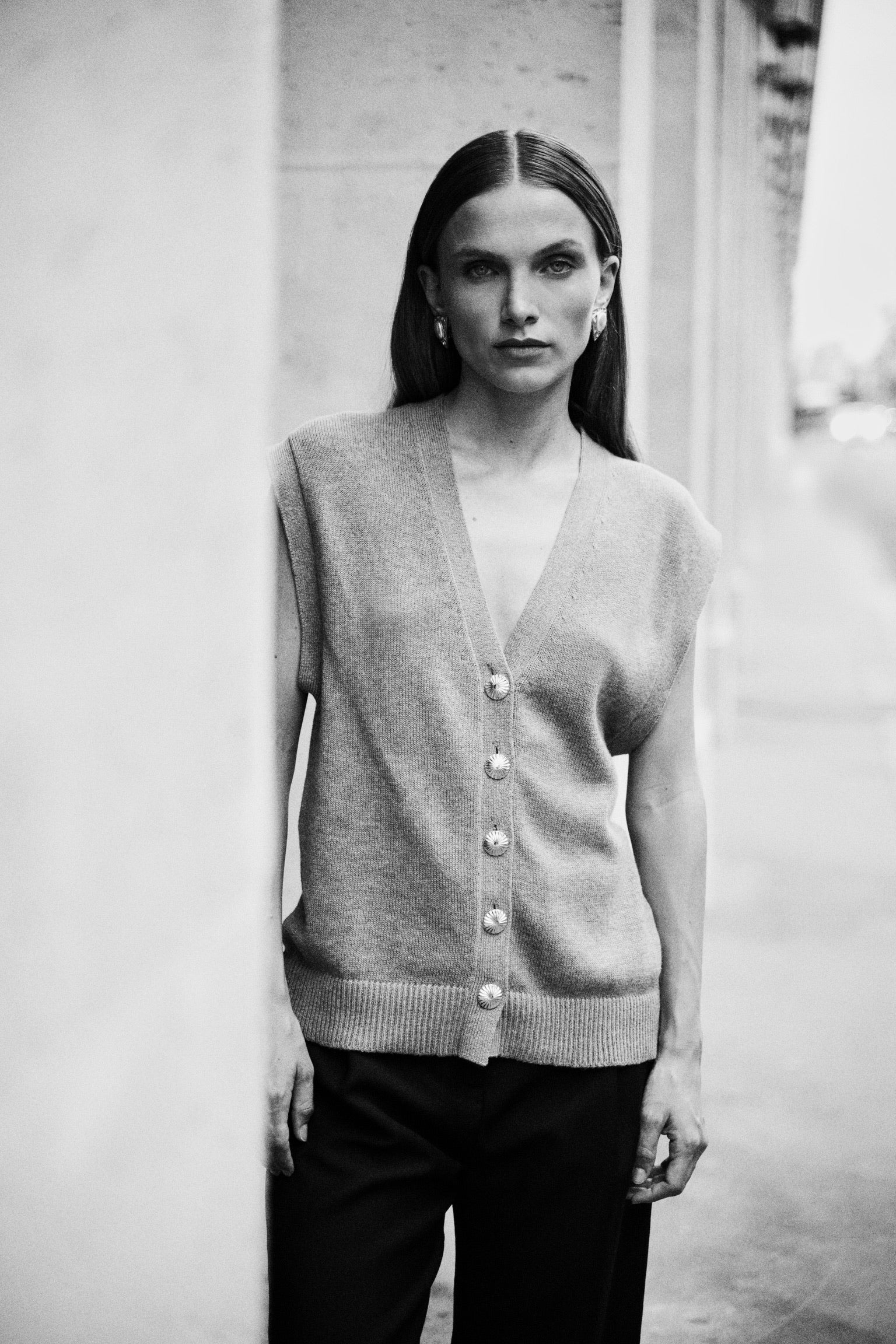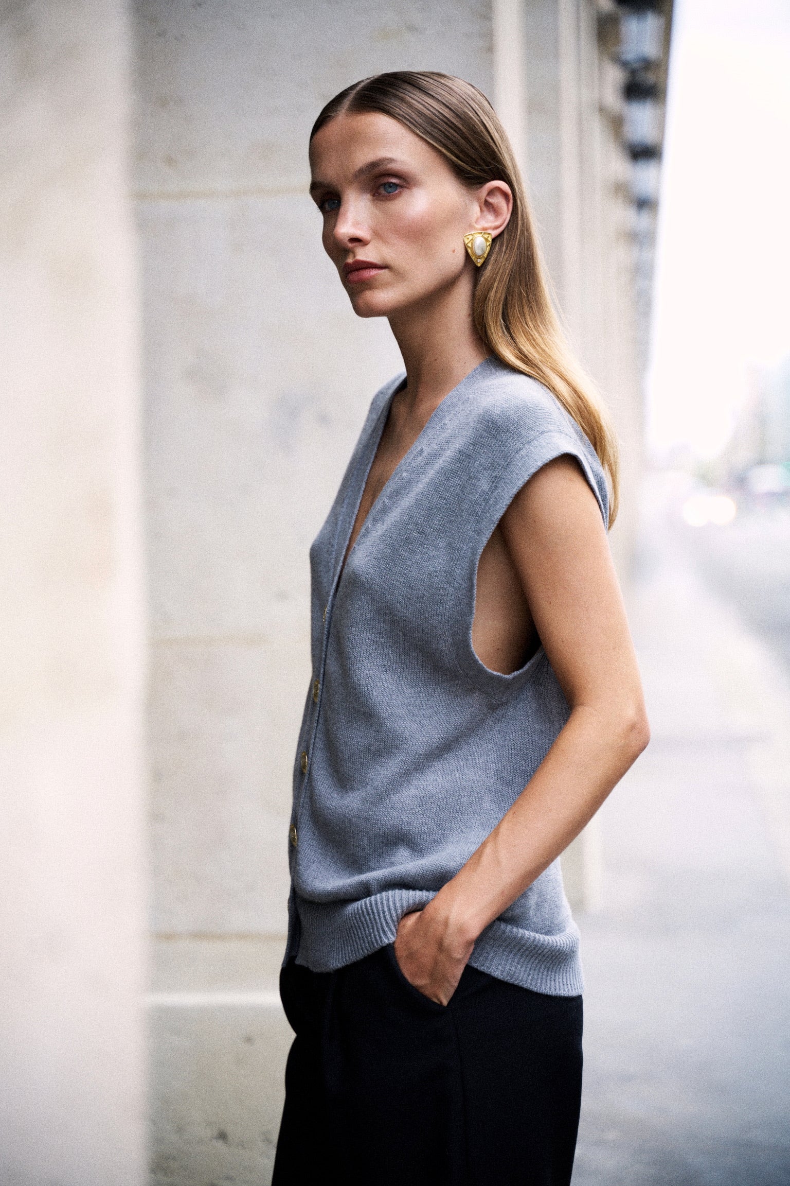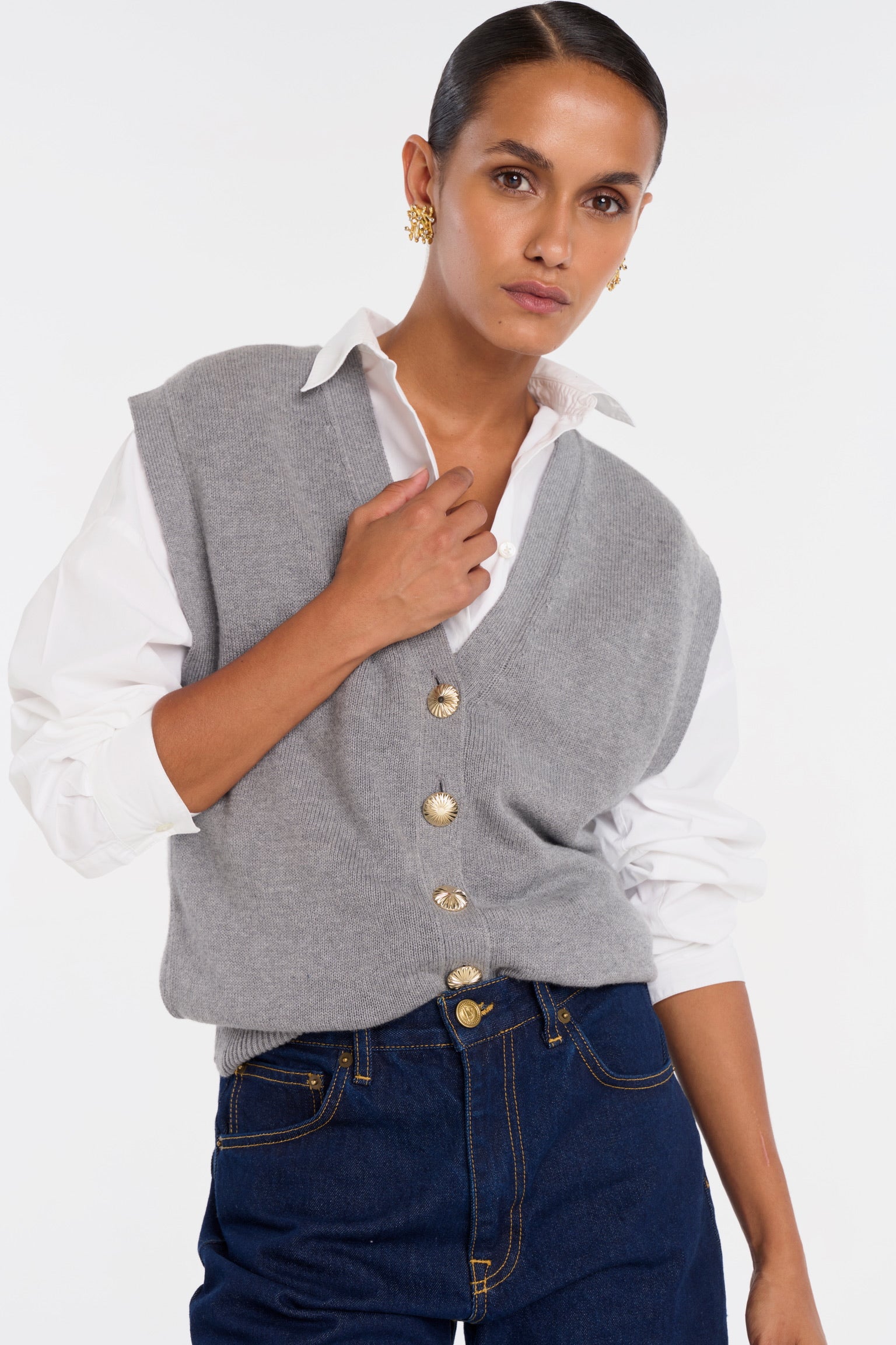 ELIO incarne le style masculin-féminin cher à ANKE. Un gilet sans manches à la coupe droite, légèrement oversize, dont la ligne d’épaule structure la silhouette avec assurance. Tricoté dans un fil de coton biologique et cachemire, il permet à la maille de rester fluide sans compromettre la force graphique de la coupe. Ses boutons dorés, choisis comme des bijoux, ponctuent le vêtement d’un éclat discret. À porter à même la peau pour une allure affirmée, ou sur une chemise blanche pour une élégance maîtrisée.