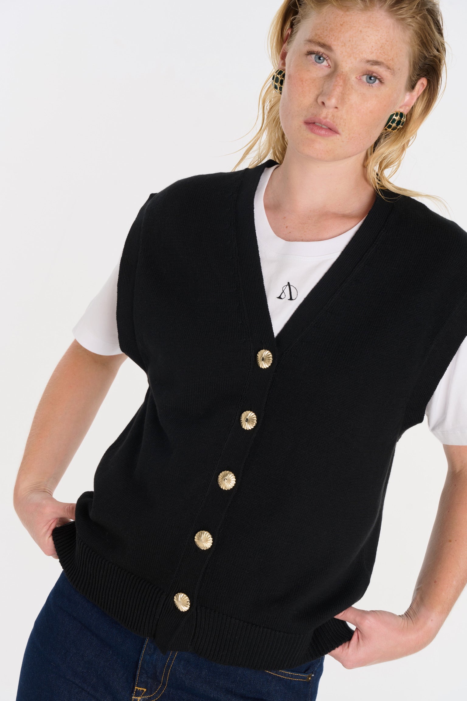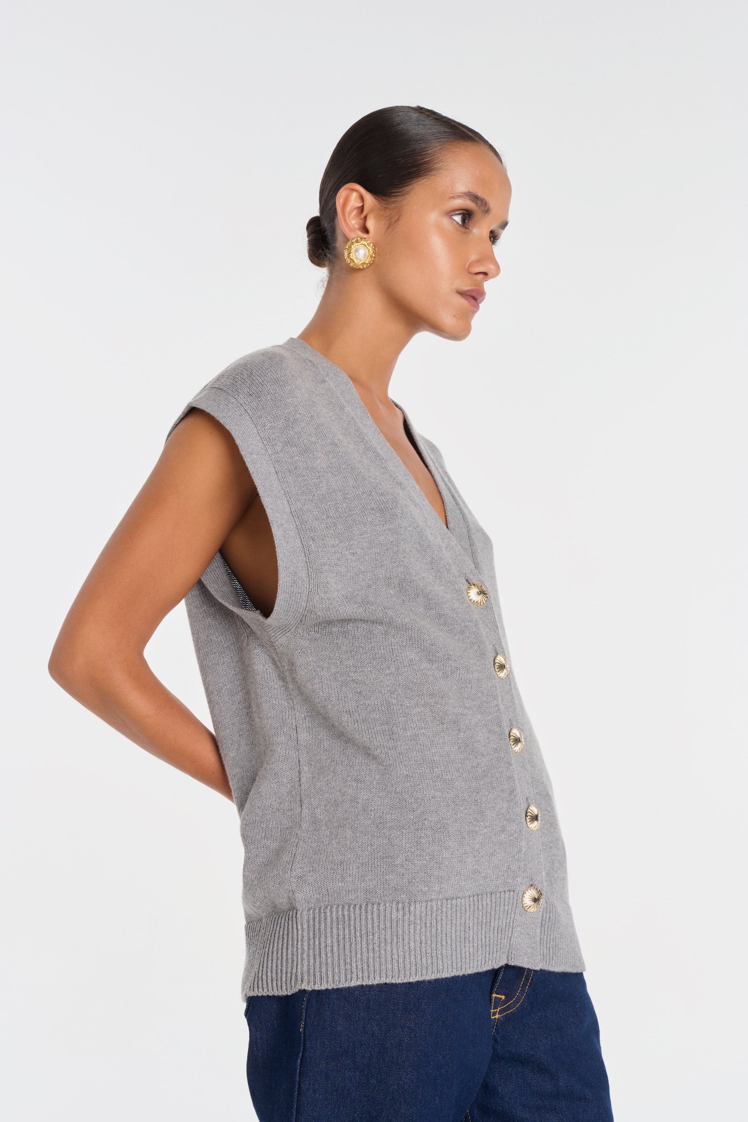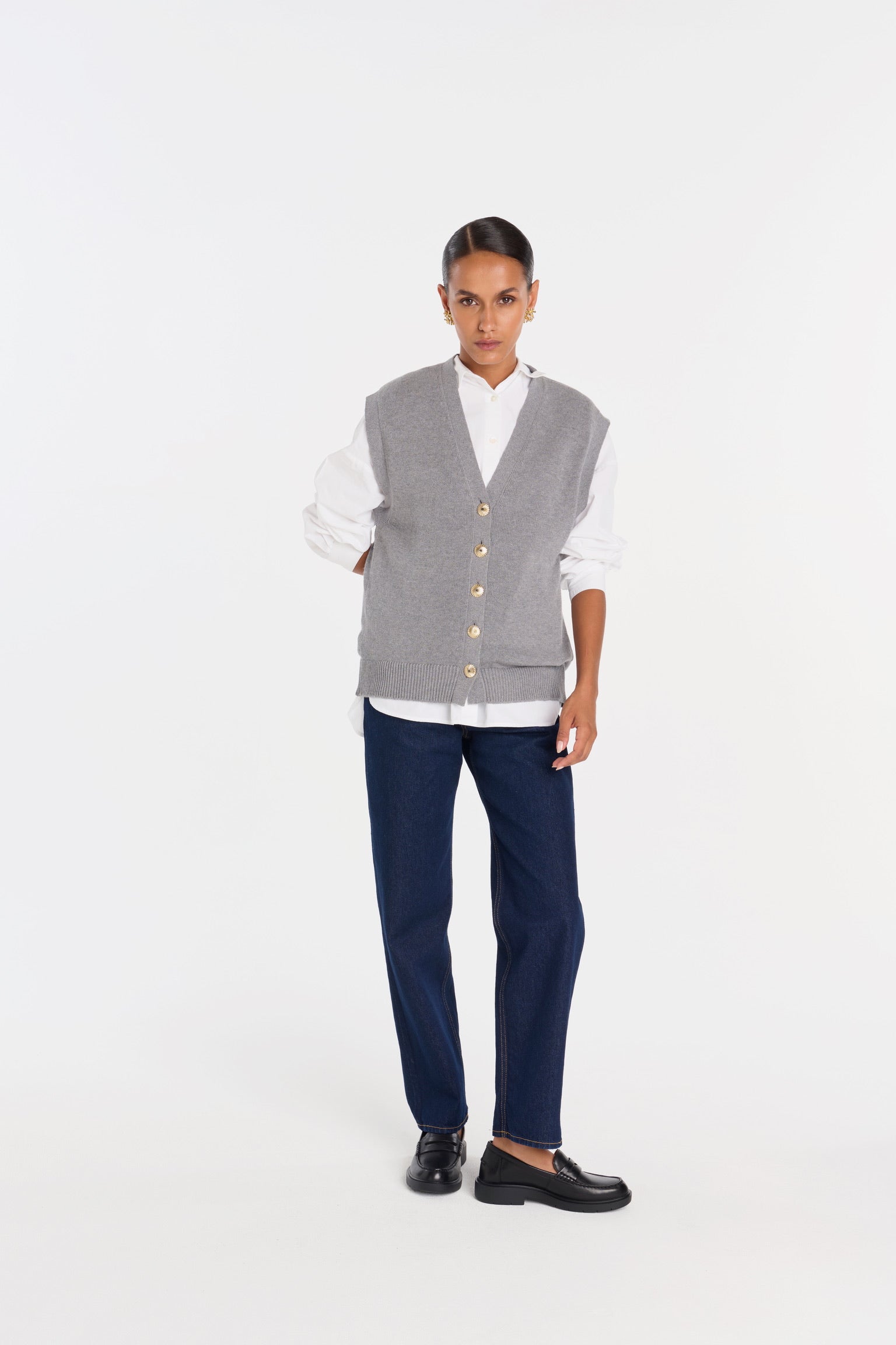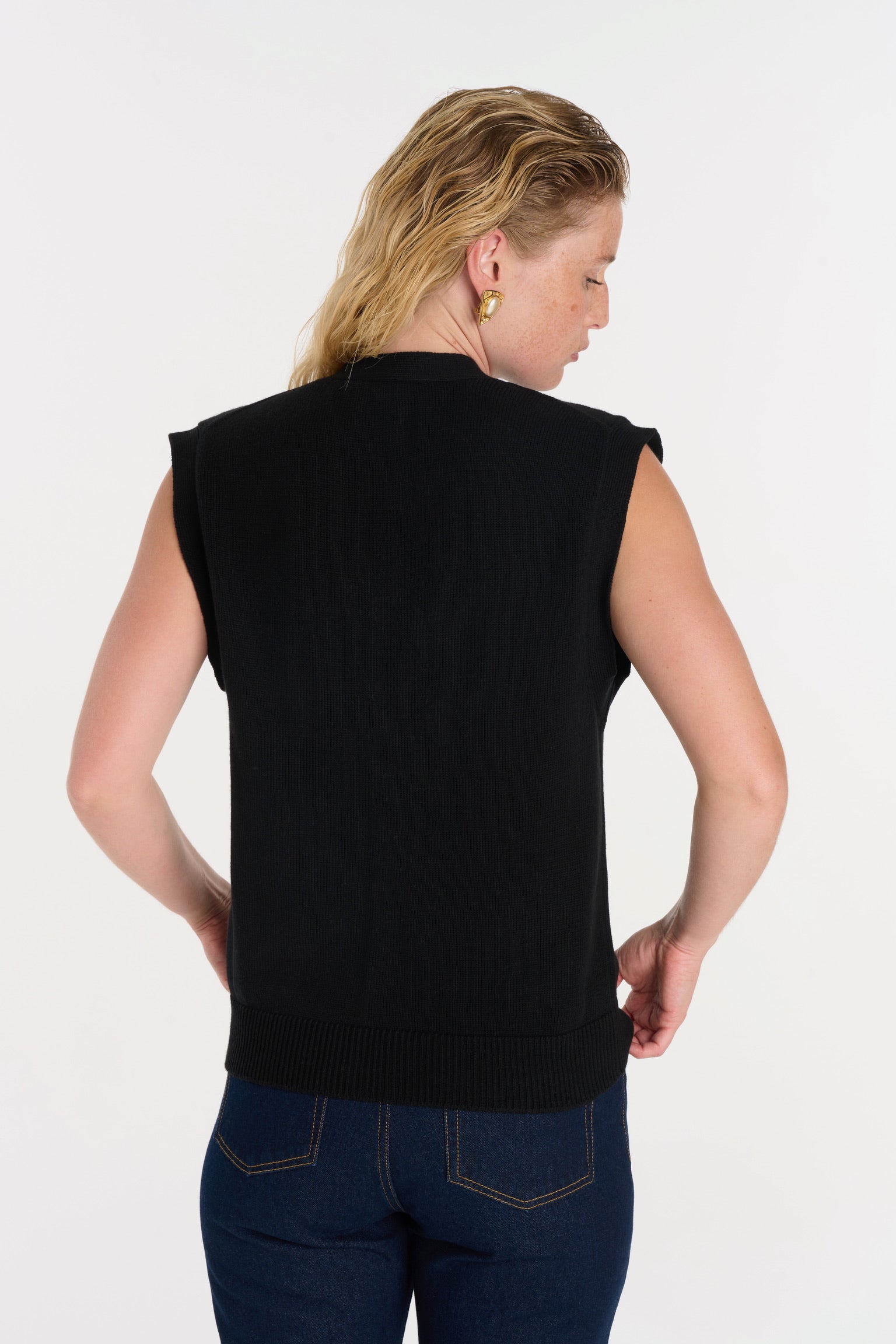 ELIO incarne le style masculin-féminin cher à ANKE. Un gilet sans manches à la coupe droite, légèrement oversize, dont la ligne d’épaule structure la silhouette avec assurance. Tricoté dans un fil de coton biologique et cachemire, il permet à la maille de rester fluide sans compromettre la force graphique de la coupe. Ses boutons dorés, choisis comme des bijoux, ponctuent le vêtement d’un éclat discret. À porter à même la peau pour une allure affirmée, ou sur une chemise blanche pour une élégance maîtrisée.