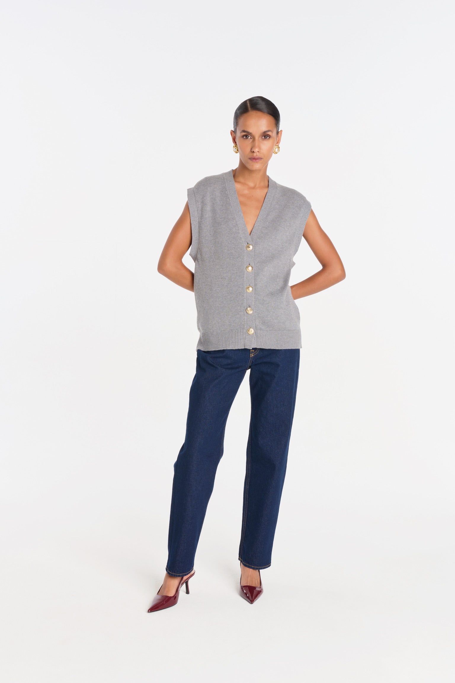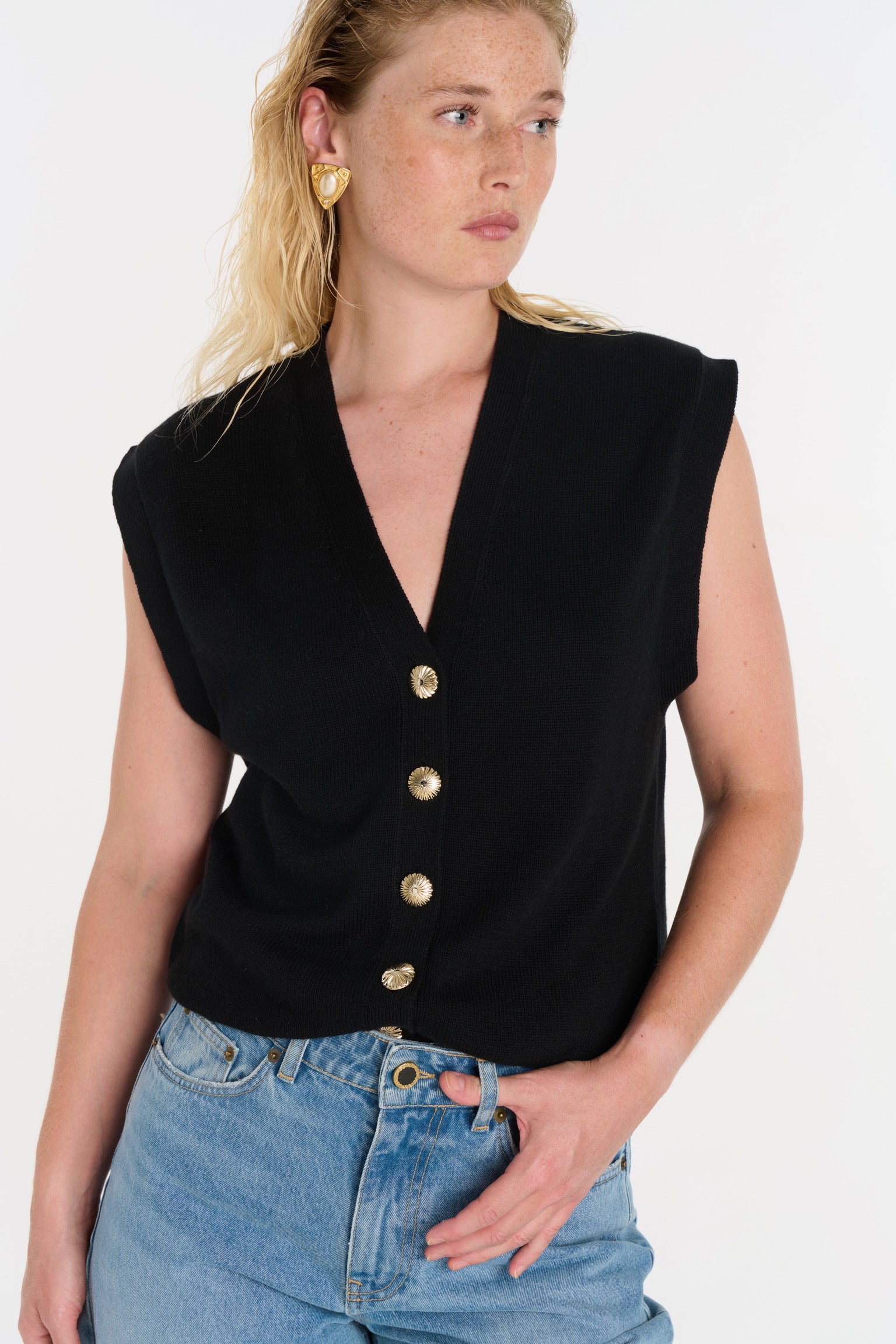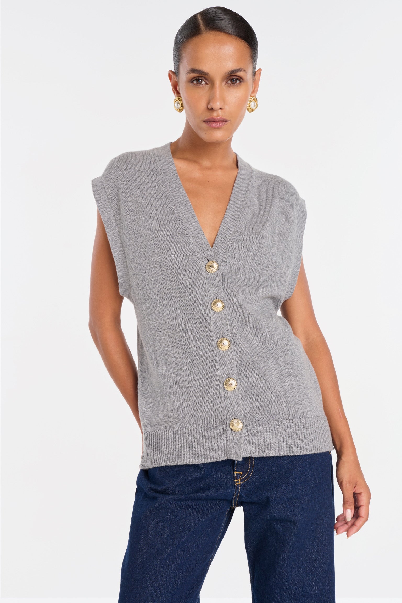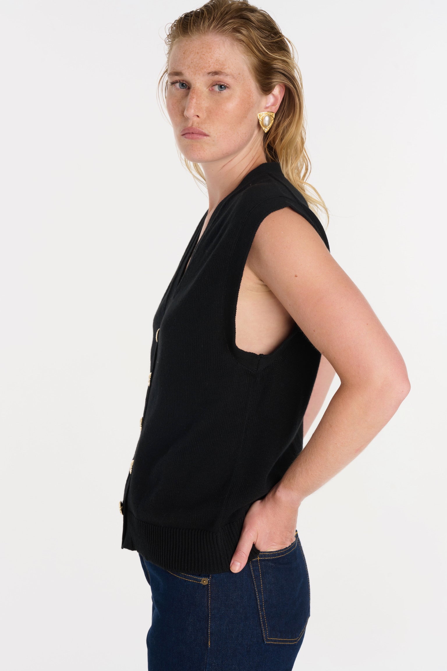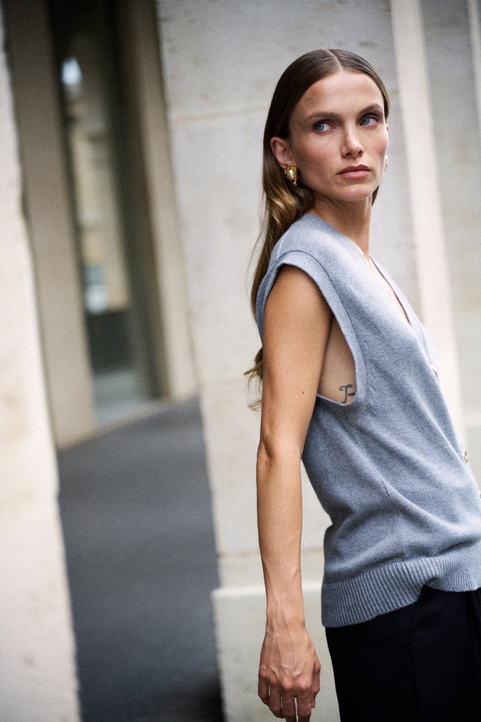 ELIO incarne le style masculin-féminin cher à ANKE. Un gilet sans manches à la coupe droite, légèrement oversize, dont la ligne d’épaule structure la silhouette avec assurance. Tricoté dans un fil de coton biologique et cachemire, il permet à la maille de rester fluide sans compromettre la force graphique de la coupe. Ses boutons dorés, choisis comme des bijoux, ponctuent le vêtement d’un éclat discret. À porter à même la peau pour une allure affirmée, ou sur une chemise blanche pour une élégance maîtrisée.