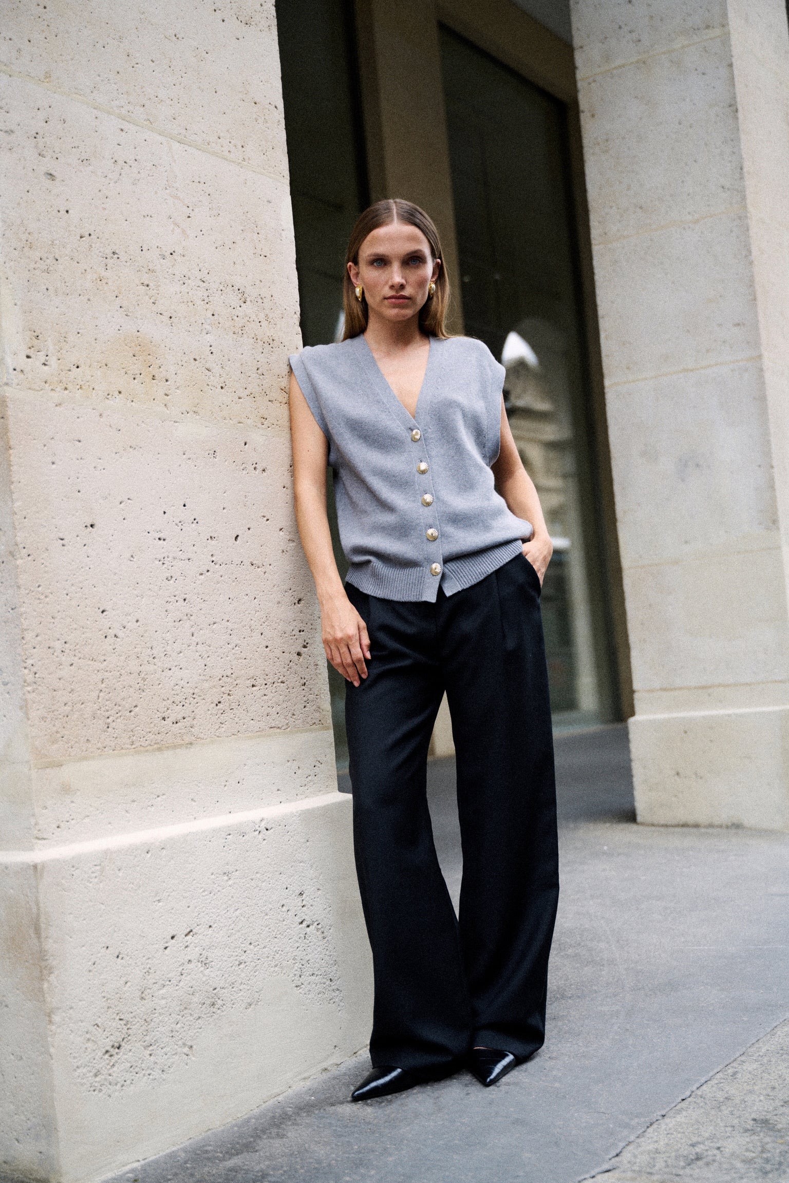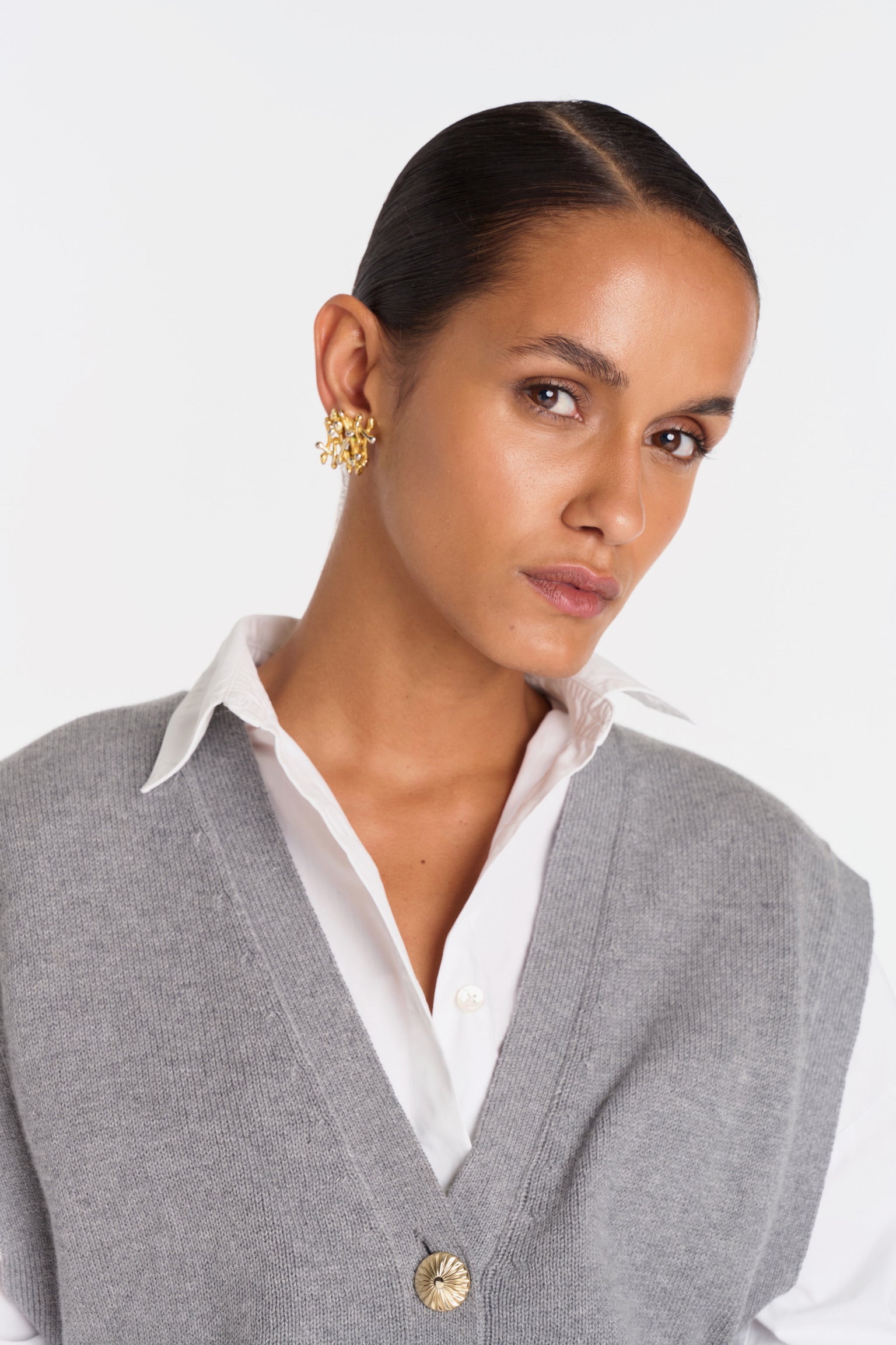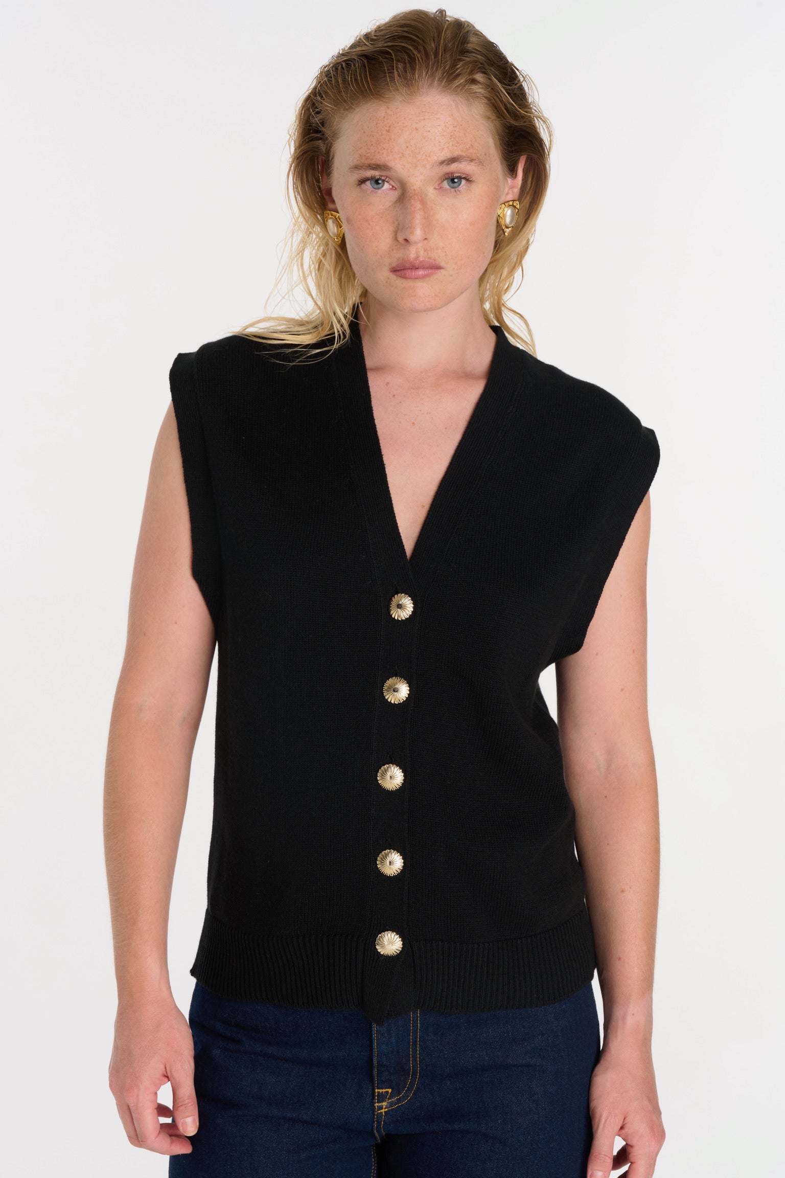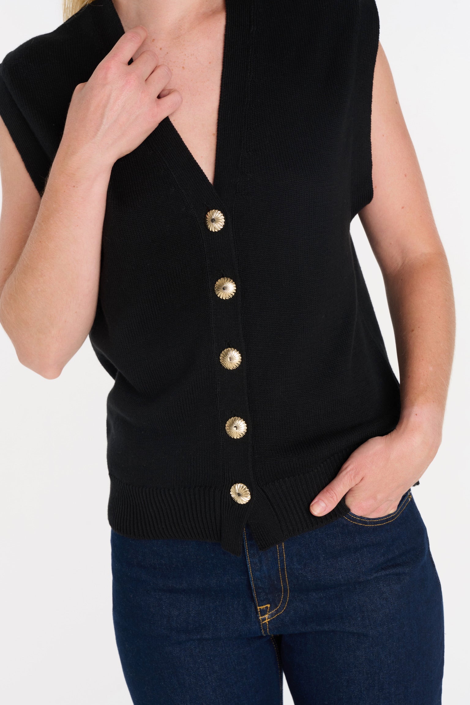 ELIO incarne le style masculin-féminin cher à ANKE. Un gilet sans manches à la coupe droite, légèrement oversize, dont la ligne d’épaule structure la silhouette avec assurance. Tricoté dans un fil de coton biologique et cachemire, il permet à la maille de rester fluide sans compromettre la force graphique de la coupe. Ses boutons dorés, choisis comme des bijoux, ponctuent le vêtement d’un éclat discret. À porter à même la peau pour une allure affirmée, ou sur une chemise blanche pour une élégance maîtrisée.