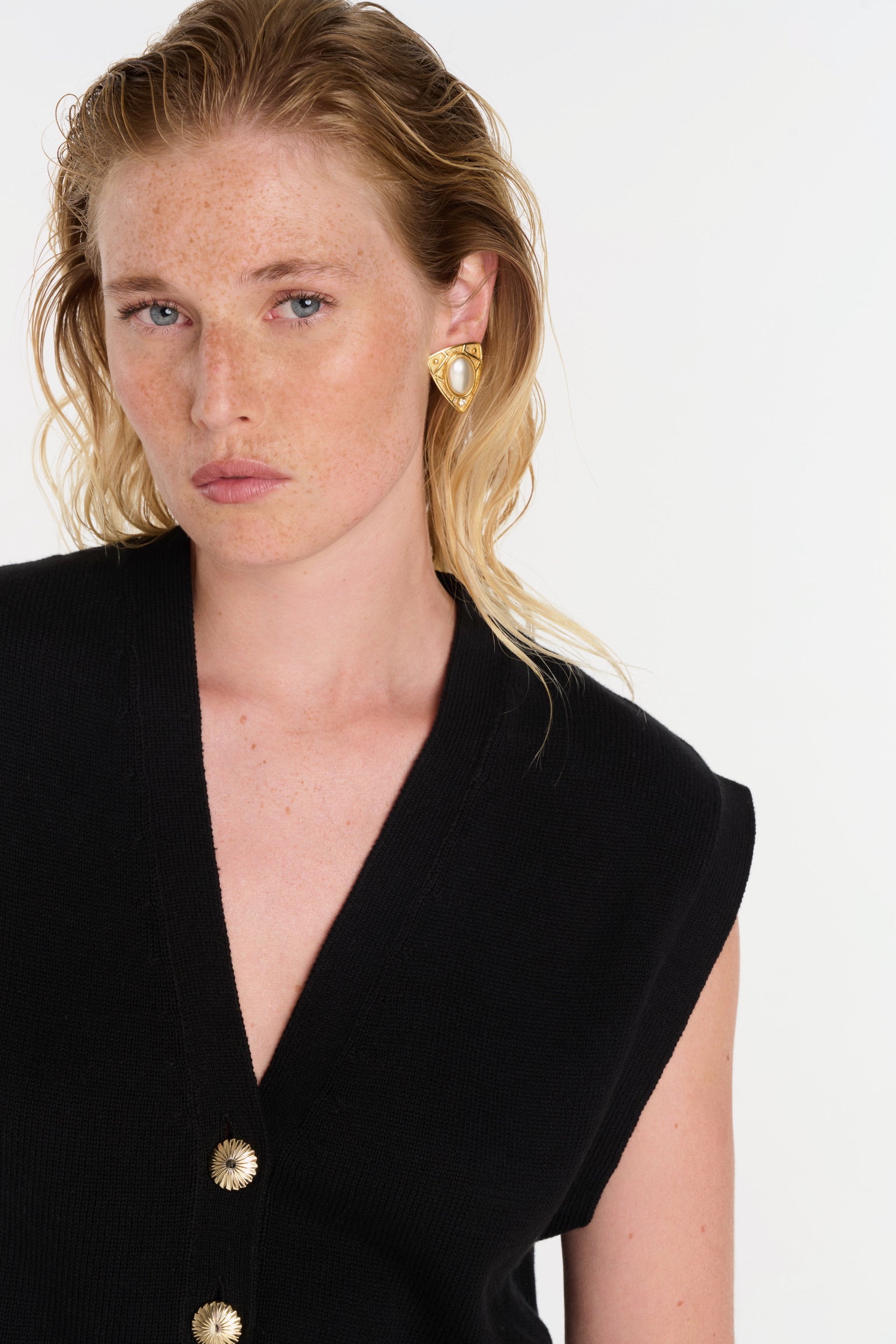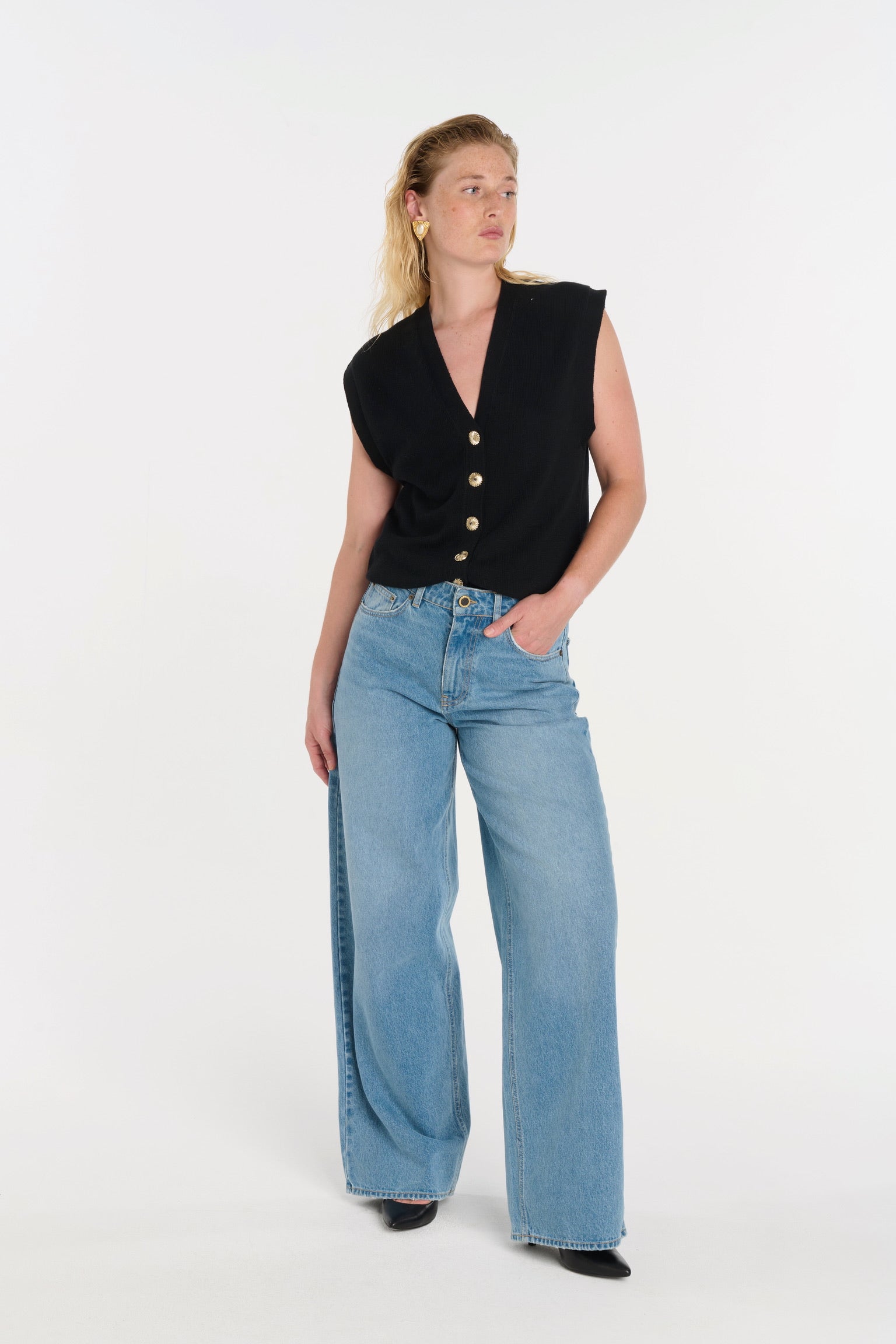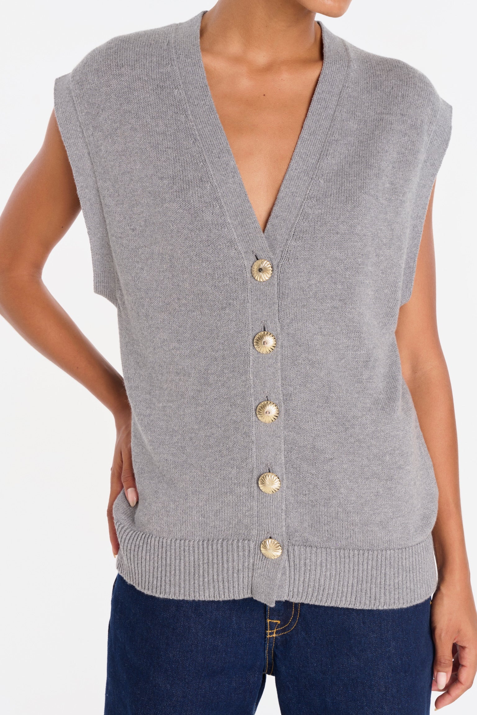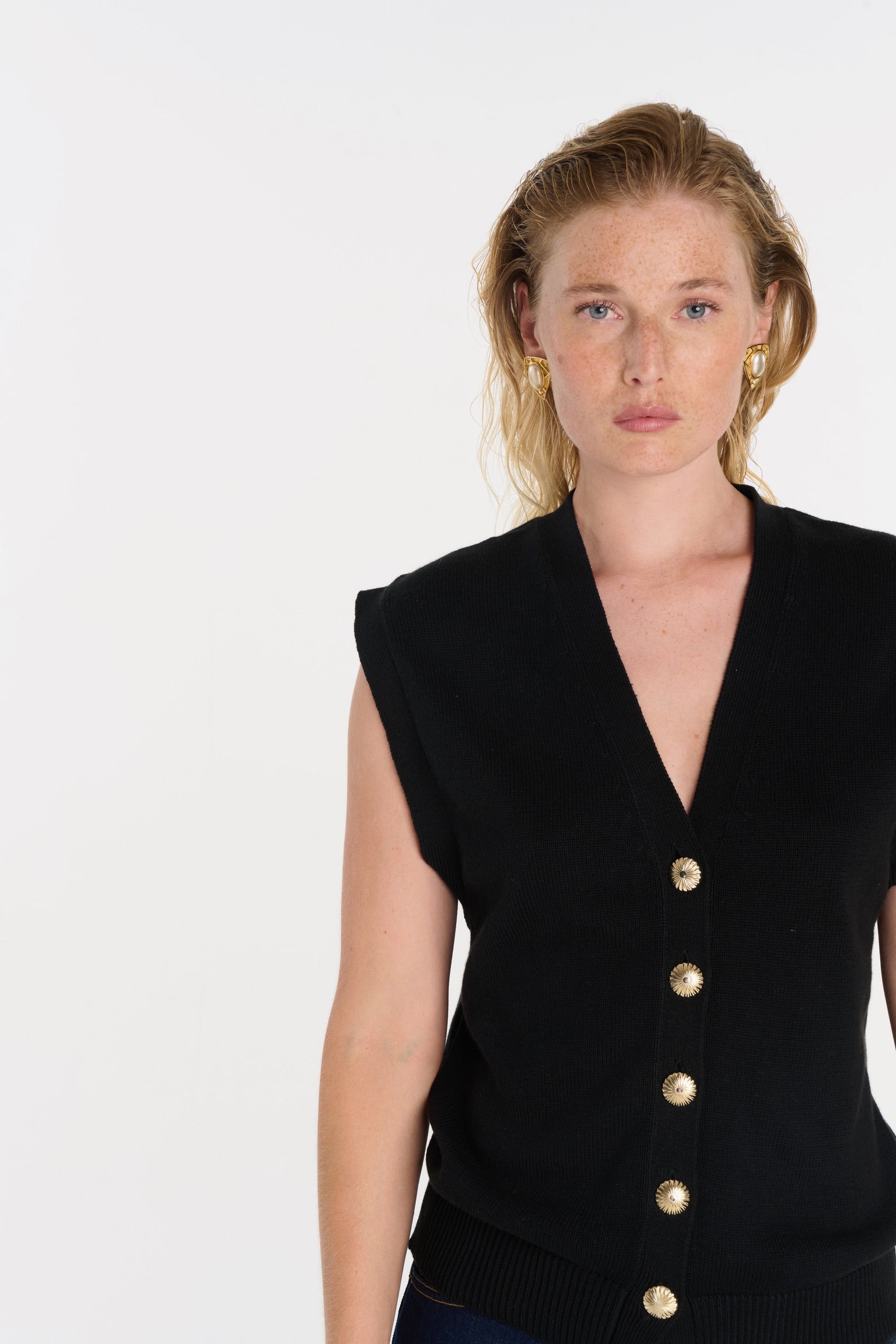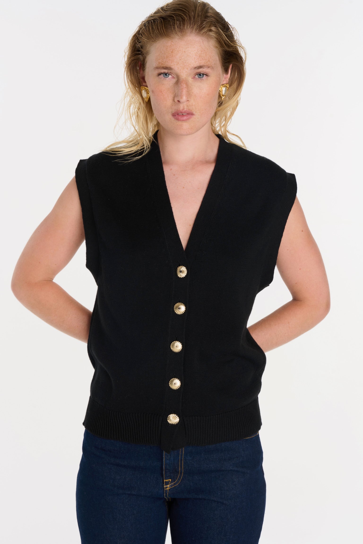 ELIO incarne le style masculin-féminin cher à ANKE. Un gilet sans manches à la coupe droite, légèrement oversize, dont la ligne d’épaule structure la silhouette avec assurance. Tricoté dans un fil de coton biologique et cachemire, il permet à la maille de rester fluide sans compromettre la force graphique de la coupe. Ses boutons dorés, choisis comme des bijoux, ponctuent le vêtement d’un éclat discret. À porter à même la peau pour une allure affirmée, ou sur une chemise blanche pour une élégance maîtrisée.