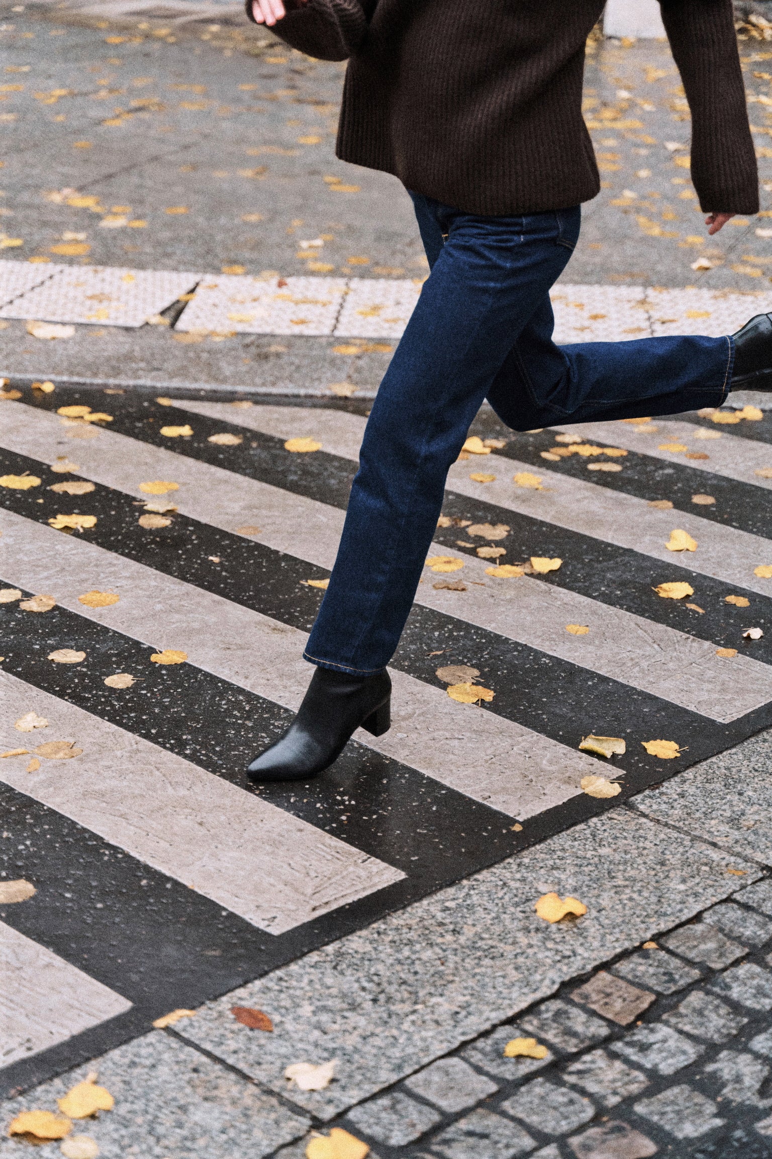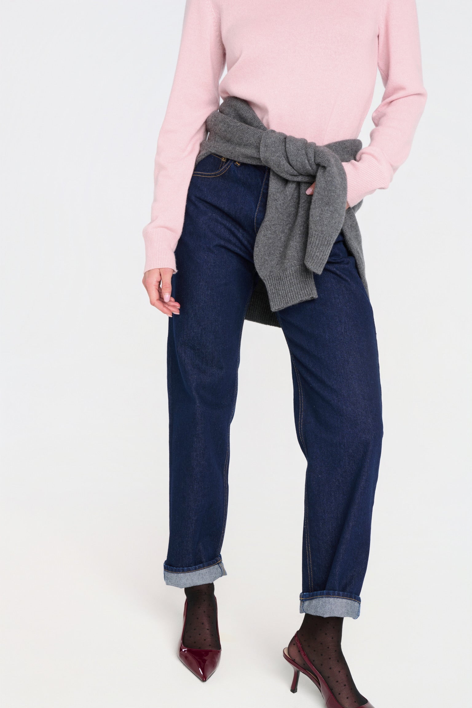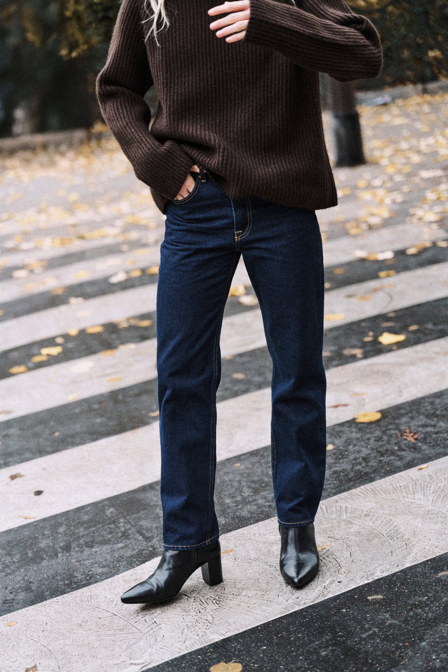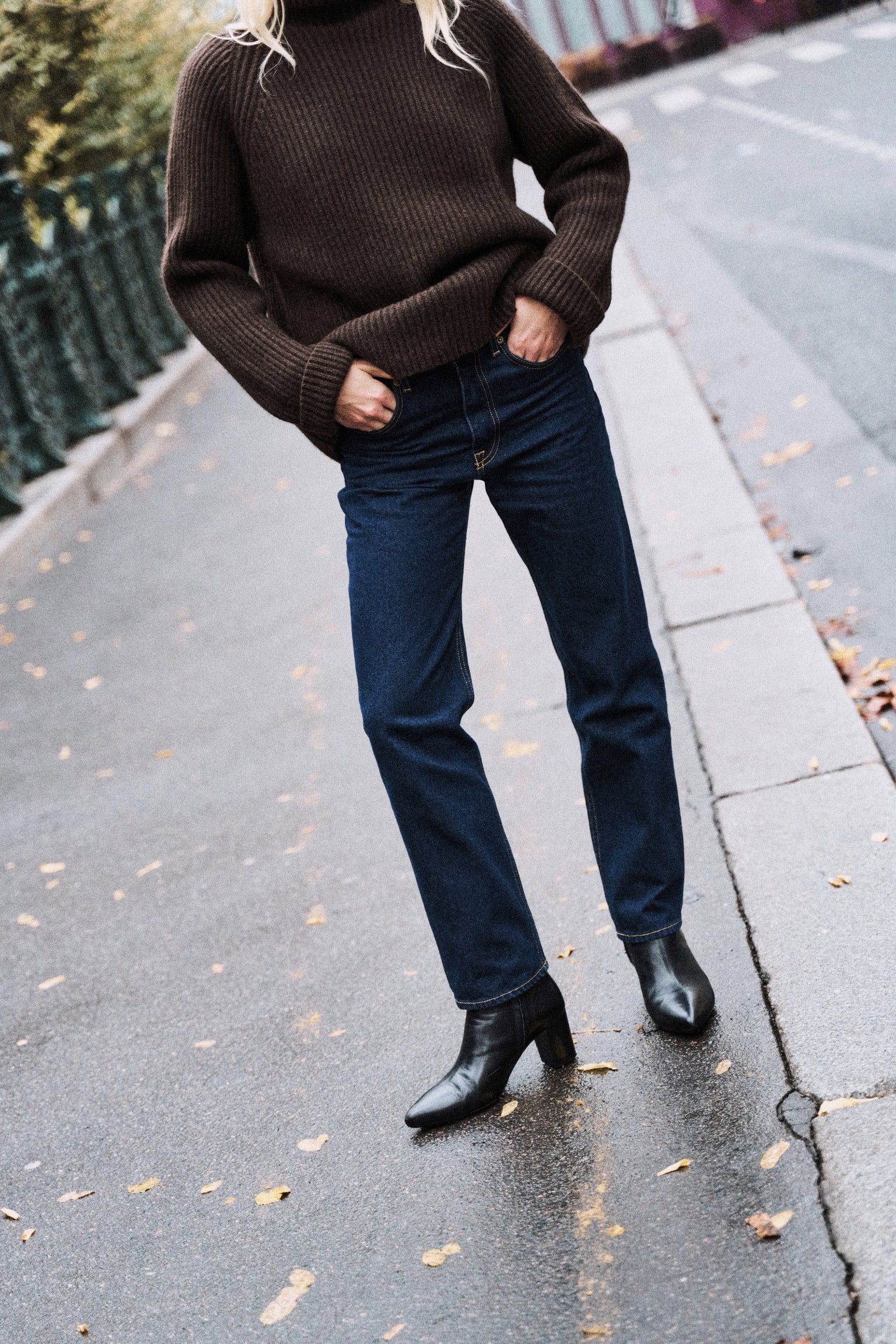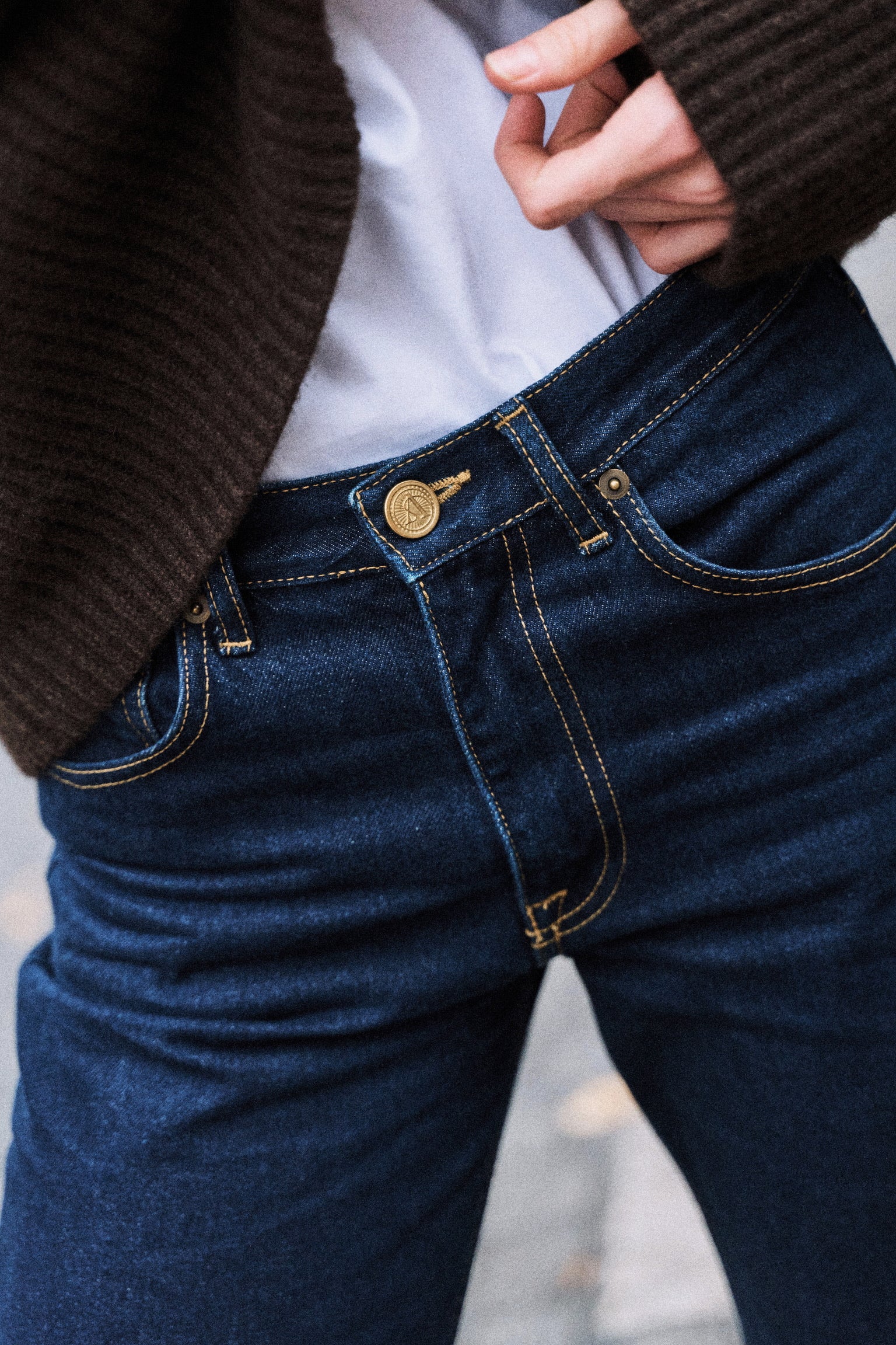 ERIN, c’est le jean droit parfaitement équilibré : une taille intermédiaire (mi-haute) qui tombe naturellement sur les hanches, une jambe droite qui affine la silhouette et une toile bleu profond au look brut, mais étonnamment souple.